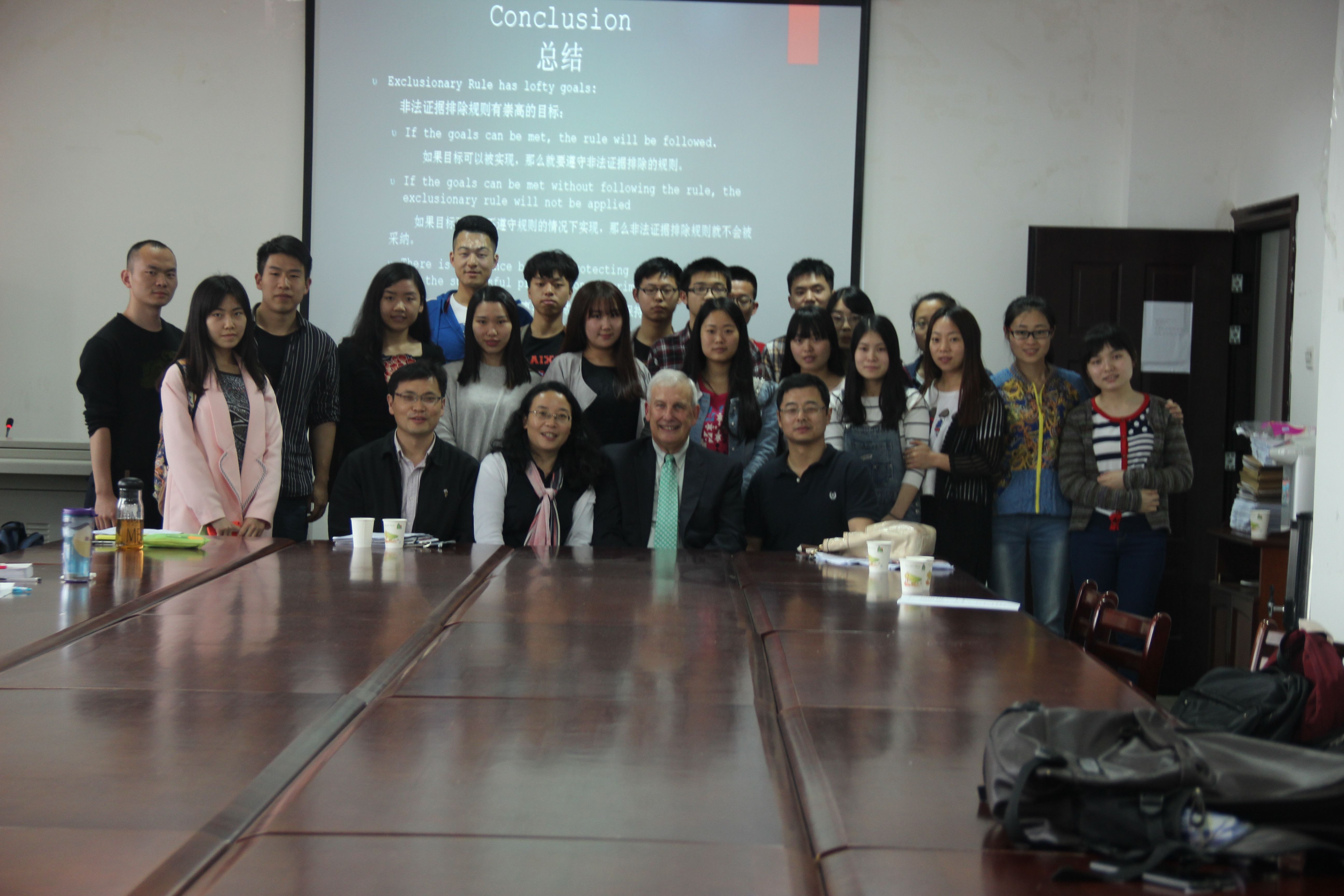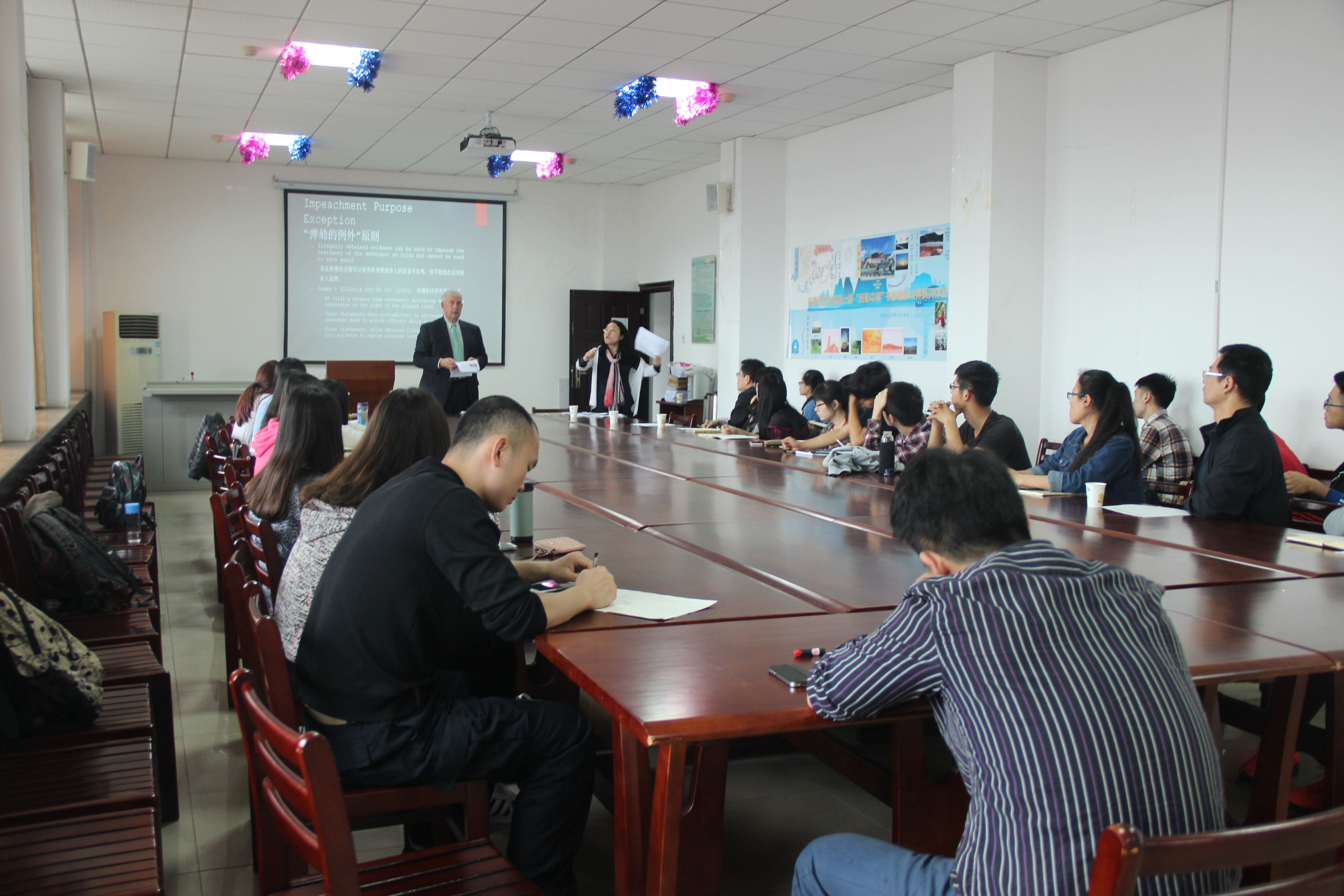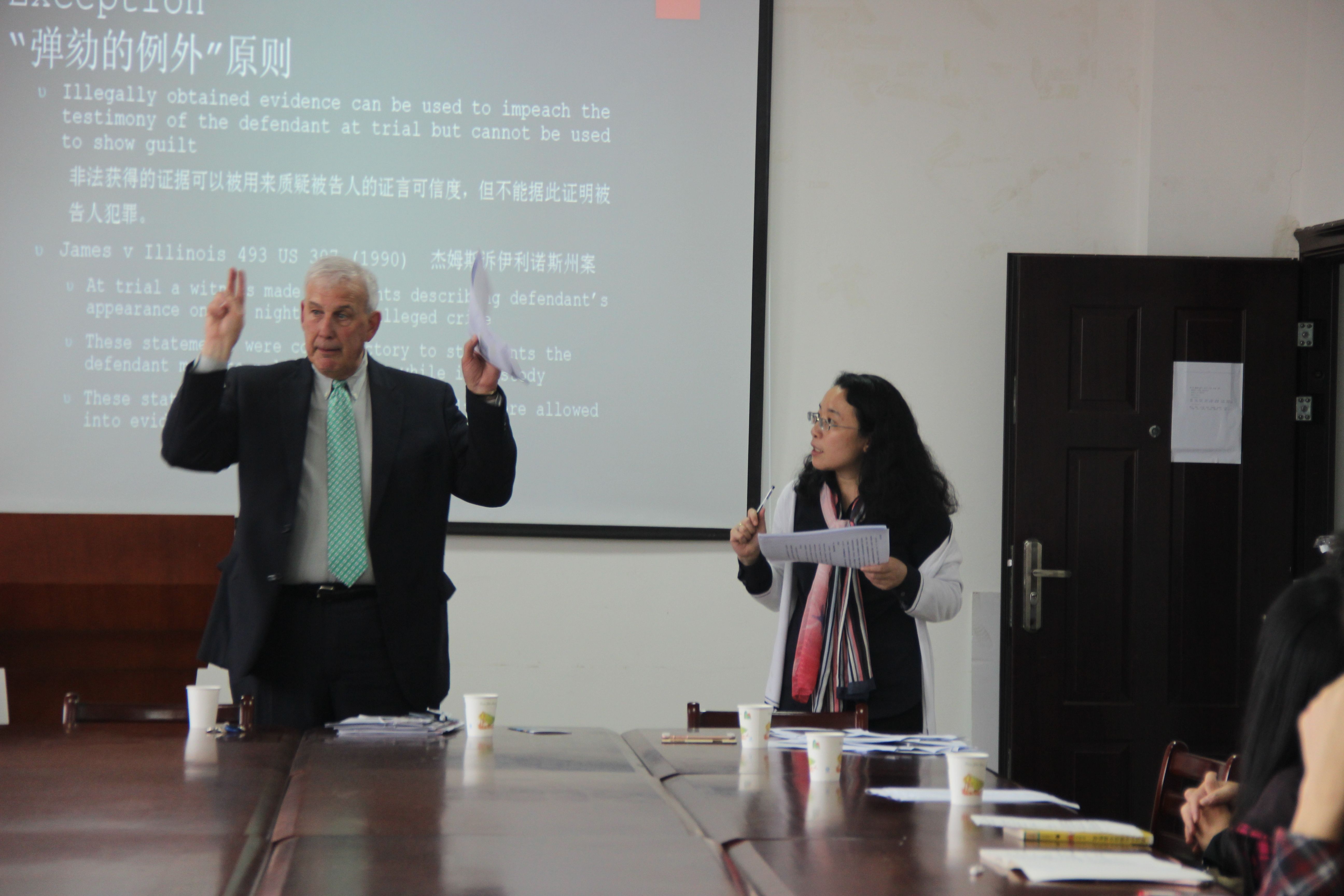 5月9日下午2:30,我院邀请到来自美国伊利诺大学法学院的教授、联邦大法官提名者、大律师Steven J Beckett教授在文治楼二楼会议室举办了一场“米兰达规则纪念五十年——非法证据排除规则是促进正义,还是阻碍正义”的学术讲座。我院院长胡向阳教授、副院长苏彩霞教授、院长助理郭泽强教授、刘建华老师等出席本次讲座,部分研究生、本科生聆听了本次讲座。讲座由我院副院长苏彩霞教授主持并全程翻译。