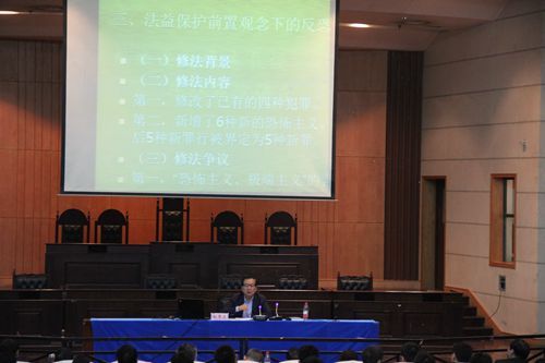 1014日上午,北京师范大学刑事法律科学研究院院长、中国法学会常务理事暨学术委员会委员、中国刑法学研究会会长赵秉志教授应邀来我校讲授“《刑法修正案(九)》修法重要争议问题”。我院组织韶关市检察机关的108名检察官参加讲座。现场座无虚席、互动频繁、气氛热烈。在场的检察官们非常感谢学院给他们提供的此次机会,表示能够听取中国刑法学界大家的讲座实属难得,且受益匪浅。