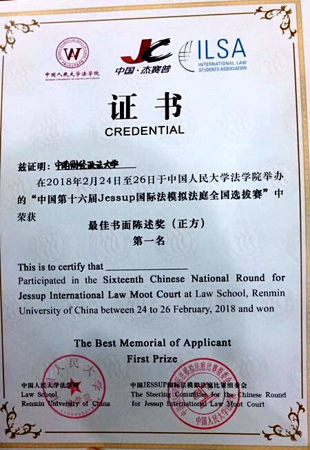 新闻网讯(学生记者 覃曦菡)2月26日,在法学院的支持下,以国际法学系邓烈教授为主教练、2016级国际法研究生余璐为助理教练,以麻豆视频 2014级职侦1401班的覃曦菡和法学院2014级本科生纪晓彤、黄盼、2015级研究生罗启越、2015级本科生张傲为队员的我校辩论队,在中国人民大学法学院举办的中国第十六届杰赛普(Jessup)国际模拟法庭全国选拔赛中斩获了“最佳书面陈述奖”第一名,展示了中南学子的风采和“双一流”法学院的实力。今年,一共有来自全国各地的四十九支高校代表队参加竞赛,最佳书状奖共设三名,我校第一次取得该单项奖,并且拿下了第一名的优异成绩。