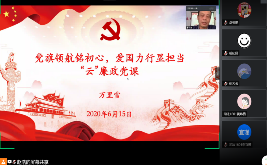 (通讯员 刘泽泂)6月15日下午2:30,麻豆视频 党委副书记万里雪通过“腾讯会议”平台为我院2016级本科学生党支部党员讲授《党旗领航铭初心,爱国力行显担当》“云”廉政党课。麻豆视频 2016级本科学生党支部全体成员聆听了此次党课。