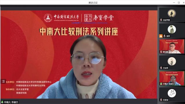 第三位与谈人李淑兰老师首先感谢了曾文科老师带来的精彩讲座,并充分肯定了曾老师的研究角度独特、较为精细化以及在理论构建与实际应用间的游刃有余。紧接着李老师也就讲座内容提出几点疑问,首先是量的防卫过当在语义上的问题,其次是一连行为理论对于防卫过当案件中主观心态判断的影响,还有就是量的防卫过当理论对于激活正当防卫与防卫过当适用的价值。最后李老师还介绍了美国刑法有关正当防卫认定方式上值得借鉴之处。