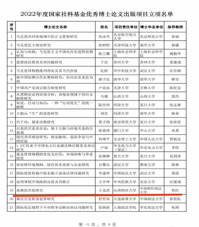 根据全国哲学社会科学工作办公室官网(//www.nopss.gov.cn/n1/2023/0206/c431030-32618664.html)的公示信息,由程红教授指导的刑法学专业2020届博士王永浩的学位论文《承继的共犯研究》获得“2022年度国家社会科学基金优秀博士论文出版项目”立项资助。
