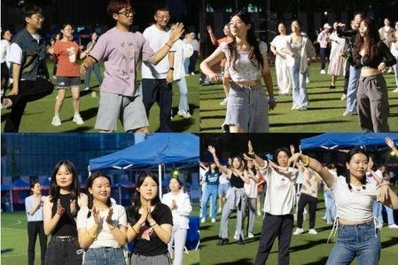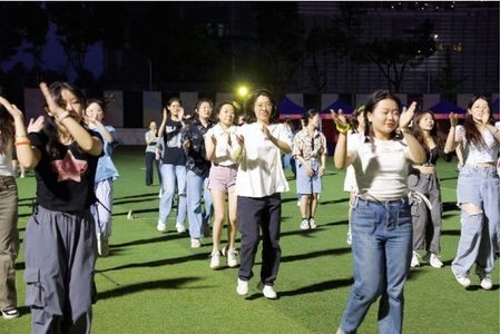紧接着,领舞们带领大家进行热身运动,同学们跟随音乐节奏尽情舒展身体,为接下来的舞蹈环节做好充分准备。