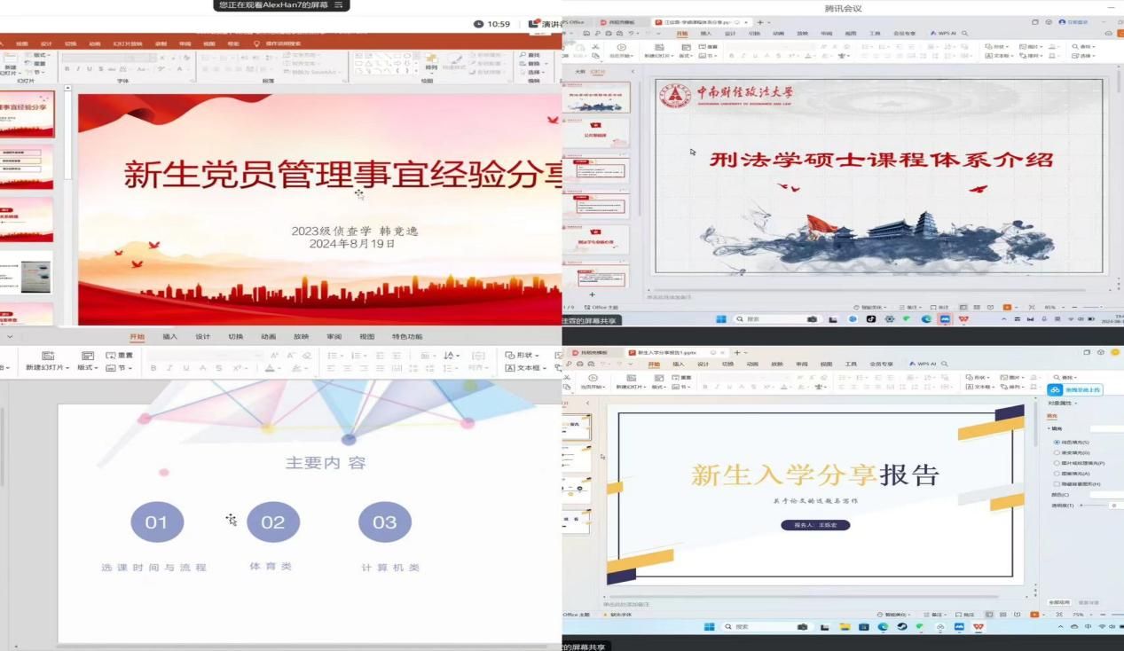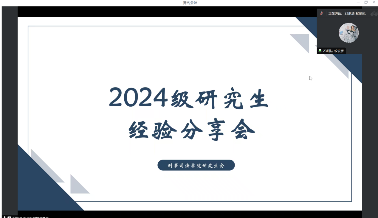 会议伊始,蚁俊彦同学就导师选择、选课分班和奖学金政策进行分享,同时向新生们介绍了学院研究生会以及班委和支委的各项职务;韩竞逸同学从组织关系转接、档案审查和材料补办等角度,为党员管理事宜提供详尽指导;江佳霖同学以刑法学为视角深入解析硕士课程体系;毛诺言同学则为大家展示麻豆视频 丰富的特色课程。
