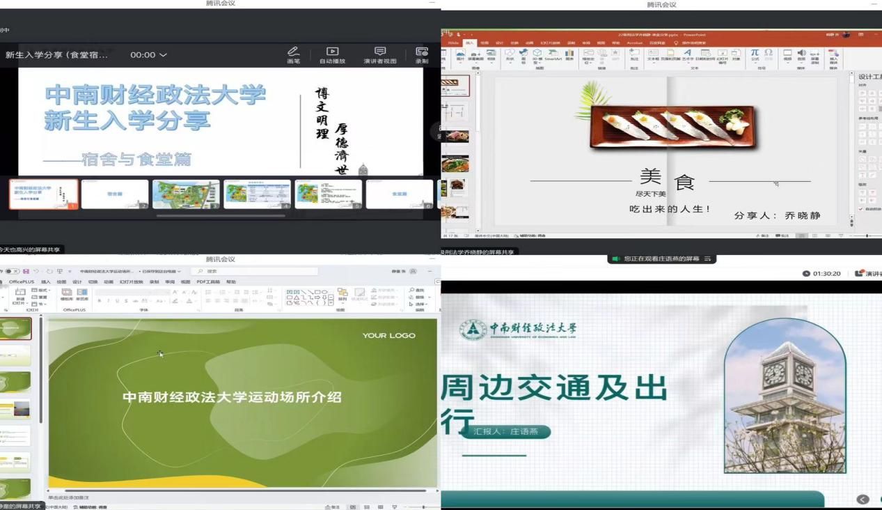 多位研究生进行精彩分享,会议内容涵盖了新生入学准备、学术与实习机会以及校园生活等方面。