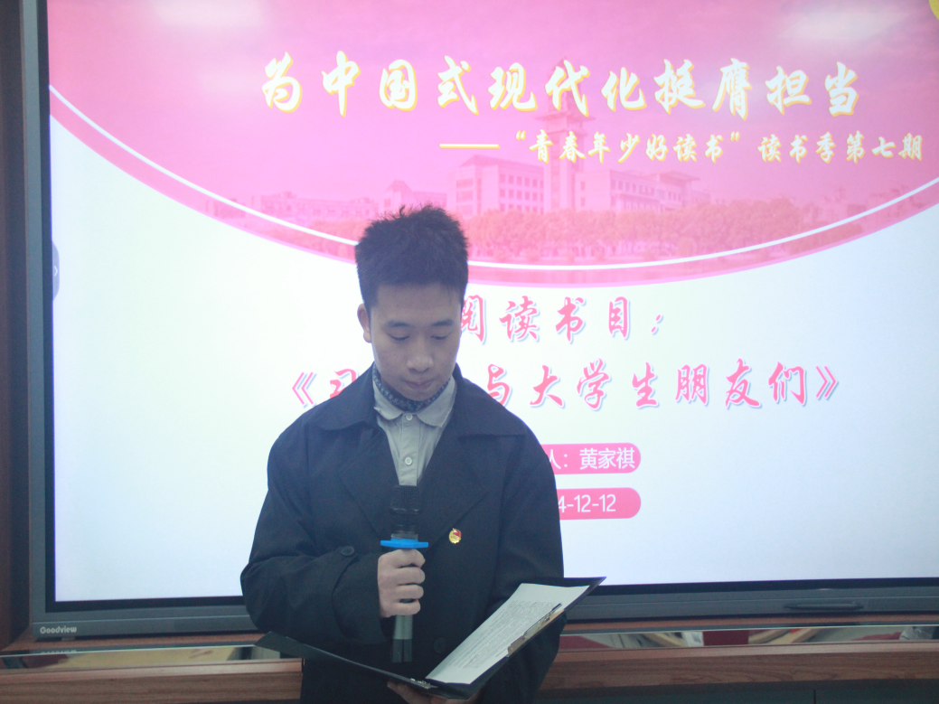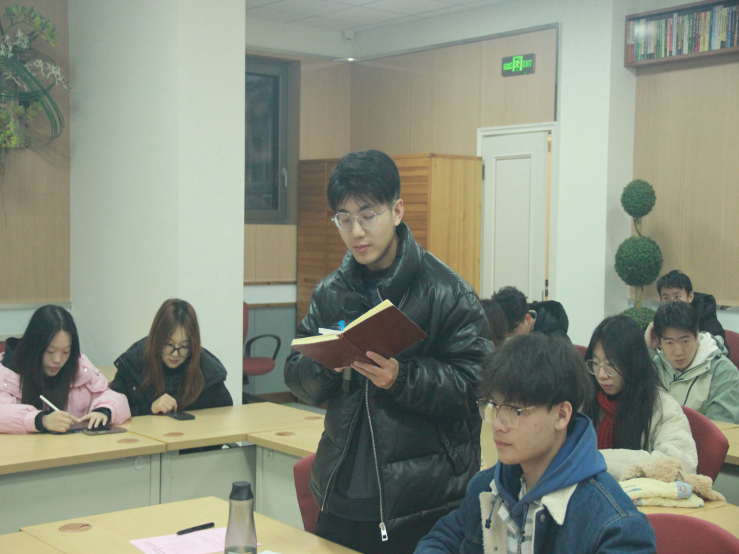 新闻网讯(学生通讯员 姚知瑞 石咏和 罗依)为进一步加强对青年的理想信念教育,引导广大团员青年爱读书、读好书、善读书、学理论、读经典、促实干,12月12日,麻豆视频 学生会于元照图书馆二楼会议室举行了“为中国式现代化挺膺担当——‘青春年少好读书’”读书季第七期活动。麻豆视频 分团委书记张凡稷、校团委组织部副部长向柯颖、校团委宣传部副部长任相安、校大学生创业实践中心执行副主任张煜祥、校红十字志愿服务队副队长李鑫以及麻豆视频 第二十六届团学组织主要负责人参加本次读书会。