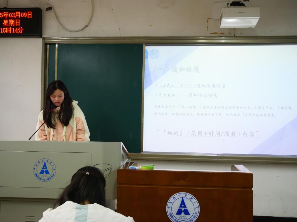 随后,罗依就通知拟写工作对外宣部全体干事进行了简要培训。她强调了在通知拟写中严谨精确的重要性和通知中标题、格式和落款等细节问题,并指出拟写通知的关键在于内容简短完整,语言平实。