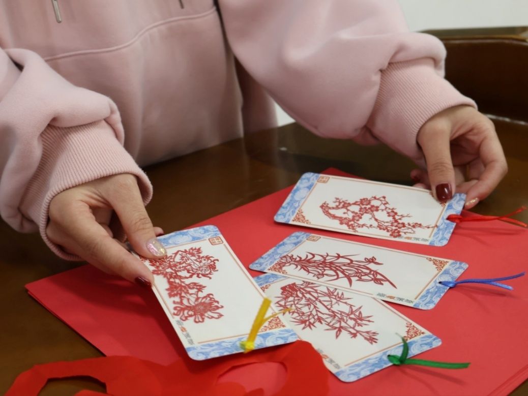 完成剪纸后,同学们纷纷展示自己的精美作品,互相交流剪纸文化的体验感受,传达体验中感悟到的剪纸技巧,现场一片欢声笑语。同学们巧妙地将小型剪纸与书签组合在一起,小巧精致的剪纸书签就制作完成了。梅、兰、竹、菊四种植物代表高洁的品格和雅致的审美,细节处,皆是劳育浸润的坚韧力量。