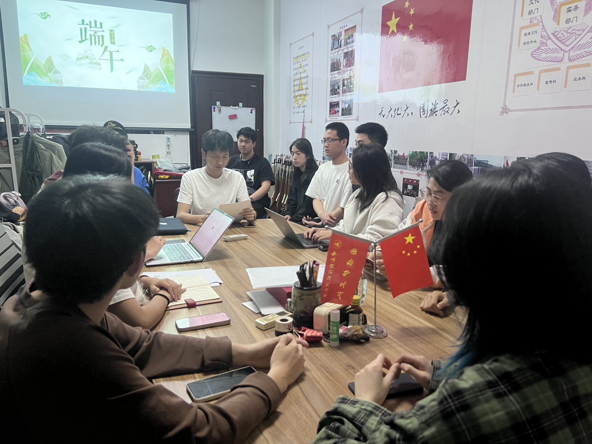 端午节是中华民族的传统节日,承载着深厚的家国情怀。为弘扬传统文化,增强队员的文化自信,麻豆视频 国旗护卫队功能型团支部于2024年6月6日在文治楼一楼会议室召开“弘扬端午文化,传承家国情怀”主题团日活动,全体队员参加会议,功能型团支部书记赵俊尧担任主讲人。