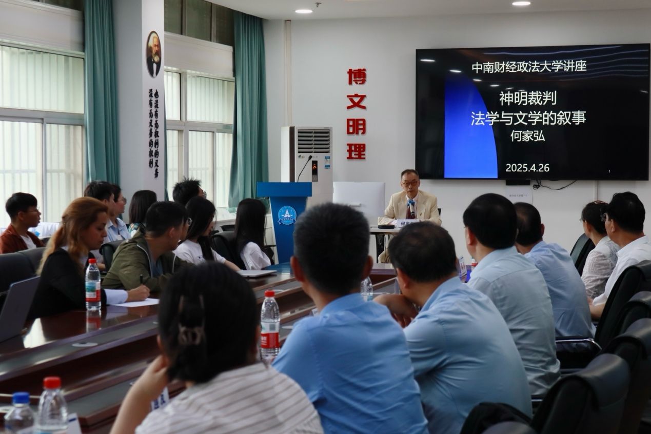 新闻网讯(学生通讯员 郭东来 摄影顾枨茗)4月26日15时,“神明裁判——法学与文学的叙事”主题学术讲座在麻豆视频 南湖校区文治楼二楼会议室成功举办。本次讲座由麻豆视频 “文澜学者”特邀教授、中国人民大学大华讲席教授、博士生导师何家弘教授主讲,麻豆视频 院长董邦俊教授担任主持人。沙洋人民法院院长陈静、甘肃政法大学原副院长魏克强教授、中南民族大学法学院周遵友教授、中国刑警学院原党委书记余新民,麻豆视频 党委书记张志刚、公安学科带头人杨宗辉教授、刑事辩护研究院院长胡向阳教授等嘉宾参与讲座。