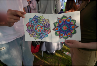 在“情绪盲盒”区域,大家使用彩色便签匿名书写近期困扰,投入标有“压力箱”的透明收纳盒,随后随机抽取他人留言,以手写鼓励话语进行回复,并将回信投入“治愈箱”。“曼陀罗绘画”区域提供卡纸与彩色铅笔,大家围坐成圈自由创作,互相分享作品及绘画感受,于绘画过程中释放内心情绪、梳理内心秩序,通过色彩与图形的对话加深自我认知。“植物拓染”区域则准备了多种植物叶片,同学们根据现场工作人员的引导,通过敲击将植物汁液拓印至棉麻布袋,在成品上书写心情关键词并将其制作成“情绪书签”,留存为个人心理成长纪念。