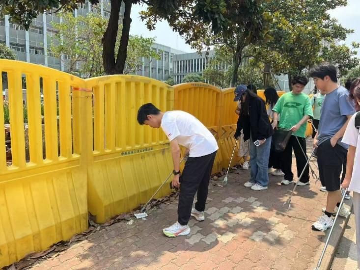 春末夏初的中南大校园草木葱茏,阳光和煦,武汉正午的烈日已有了些许灼热,但没有一位志愿者退缩。14时,志愿者们手持扫帚、垃圾夹、环保袋等工具,准时在文治楼前集合。活动负责人简要说明分工后,同学们分组前往保卫处前道路、中区花园及教学楼周边区域,有序开展清洁工作。没有在树荫下偷懒乘凉的,更没有迟到早退的,相反,志愿者们穿梭于绿荫步道与花坛间,仔细清理散落的纸屑、塑料袋,弯腰拾起草丛中的饮料瓶,甚至耐心抠出石缝里的烟蒂。针对春季风大导致的落叶堆积问题,大家分工协作,有的负责清扫路面,有的将落叶装入环保袋集中处理。
