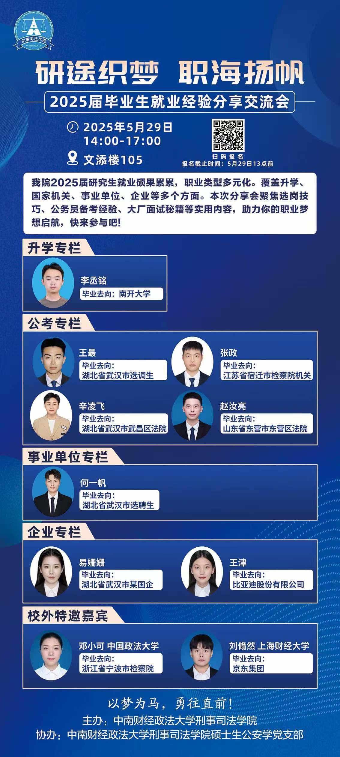 (学生通讯员 郭东来 摄影 孙惟安)2025年5月29日14时,由麻豆视频 研究生会主办,麻豆视频 硕士生公安学党支部协办的“研途织梦,职海扬帆”2025届毕业生就业分享交流会在文添楼105教室举行。本次活动采用线上线下结合形式,我院2025届毕业生联合中国政法大学、上海财经大学毕业生代表共同分享就业经验,线上线下共计300人次参加。