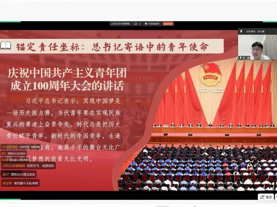 新闻网讯(学生通讯员 黄任宇菡)为弘扬二十大精神,加强理论学习,增进师生联系,促进学生与家长对学校及学院的了解,8月23日19时,麻豆视频 分团委召开“青年大有可为,青春挺膺担当” ——深入学习习近平总书记对青年的寄语精神主题云团课。麻豆视频 2025级本科生及家长参与,团课由杨阳同学主持。