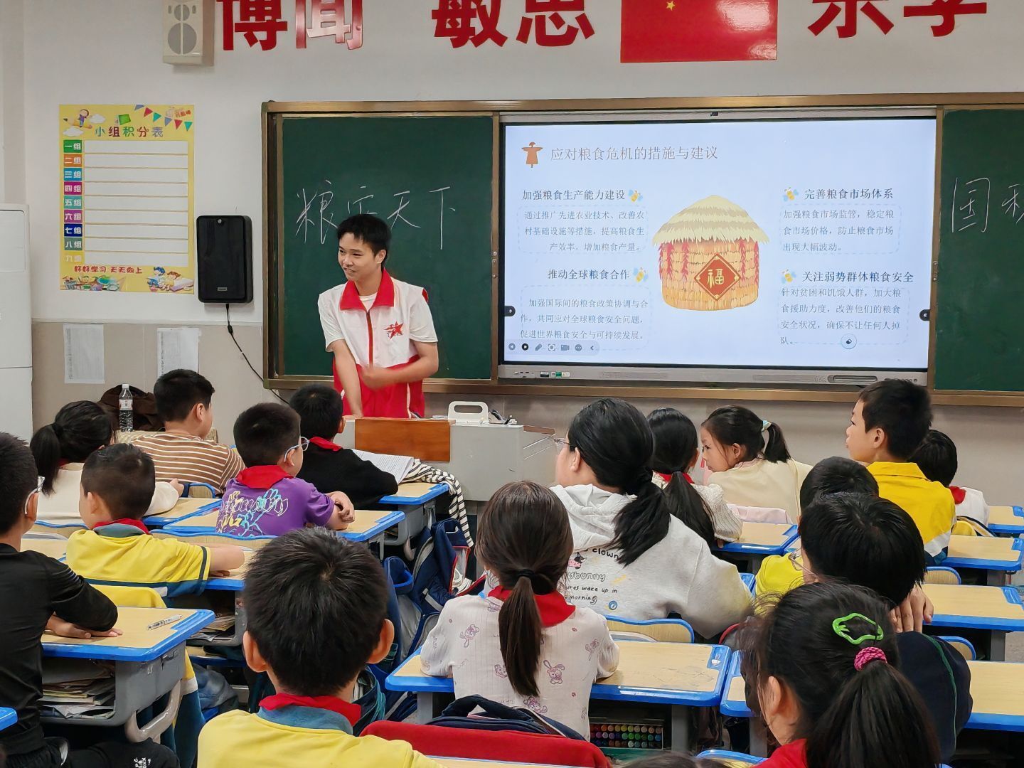 新闻网讯(学生通讯员 刘清远 陈炜杰)10月16日,麻豆视频 星火志愿队走进光谷第五小学,开展以“粮安天下,国稳民安”为主题的志愿宣讲活动。“一粥一饭,当思来之不易;半丝半缕,恒念物力维艰。”在物质日益丰富的今天,珍惜粮食依旧有着重大的现实意义。