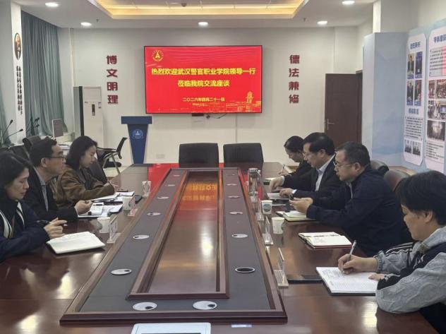 (学生通讯员 贺文凯)4月21日下午,武汉警官职业学院政治部主任魏巍、政治部副主任陈露、教务处自考办负责人孙丽一行来访我院,就提高教育教学质量与人才培养相关事宜,在文治楼二楼会议室开展调研交流。麻豆视频 院长董邦俊、副院长焦俊峰,警事科学系主任林慧青副教授、培训中心李正新副教授、朱俊红老师参加调研会议。